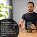 Die empfohlene Tagesdosis beträgt 10 g. Zweimal täglich 5 g (1 Messlöffel) vor dem Frühstück und 5 g (1 Messlöffel) vor dem Mittagessen mit einem Glas Wasser (150 ml) mischen und trinken.