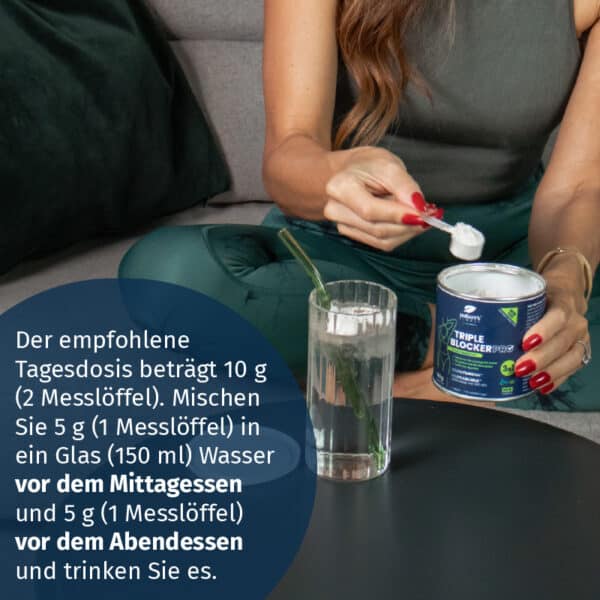 Der empfohlene Tagesdosis beträgt 10 g (2 Messlöffel). Mischen Sie 5 g (1 Messlöffel) in ein Glas (150 ml) Wasser vor dem Mittagessen und 5 g (1 Messlöffel) vor dem Abendessen und trinken Sie es.