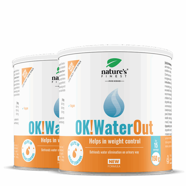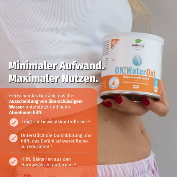 Jeden Tag 2 Messlöffel (10 g) OK!WaterOut-Getränk in ein Glas Wasser geben. Mit einer Portion nehmen Sie 100 mg Brennnesselextrakt, 100 mg Holunderextrakt und 50 mg Knöterichextrakt auf.